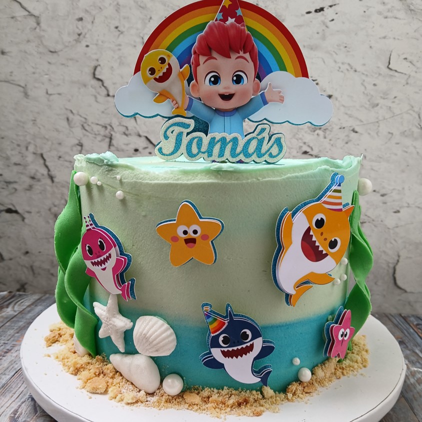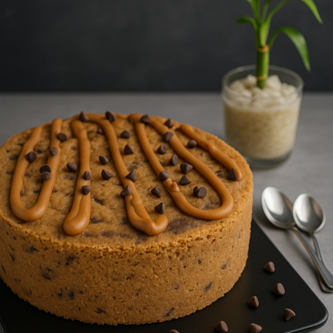 Pastel de galleta de vainilla con chispas de chocolate, horneada en forma de pastel de cumpleaños. Rellena con dulce de leche o crema de chocolate. ¡Cada mordida es una fiesta!